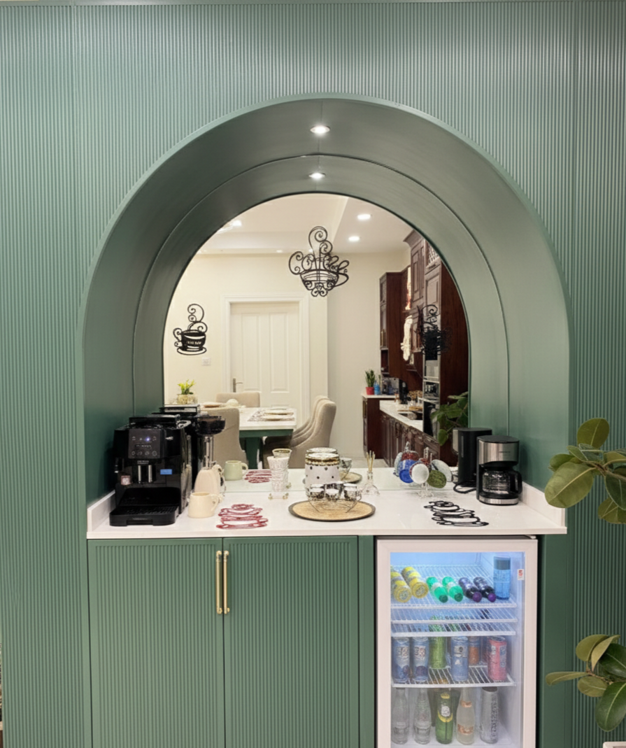 ركن قهوة مودرن, ديكور قطر, ركن قهوة أخضر, ثلاجة مدمجة, مرايا أقواس, أثاث الدوحة, تصميم داخلي قطر, Modern Coffee Corner, Qatar Decor, Green Coffee Station, Arched Mirror, Built-in Mini Bar, Luxury Furniture Doha, Custom Coffee Barركن قهوة عصري “مودرن” بلون أخضر مع مرآة بشكل قوس وثلاجة مدمجة)،