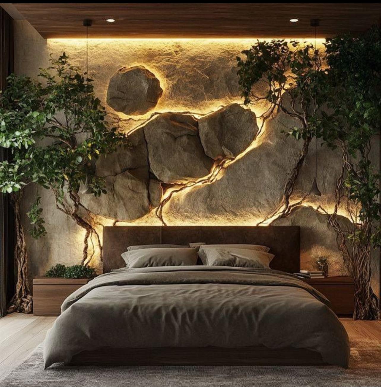 هل تبحث عن التميز؟ اجعل سريرك هو نجم الغرفة. نقدم لك دمجاً عبقرياً بين الأثاث والديكور: سرير أنيق بقماش فاخر يستند إلى خلفية جدارية صخرية ثلاثية الأبعاد مع إضاءة LED مدمجة. تصميم يسرق الأنظار ويضيف لمسة درامية وفخامة فورية لأي مساحة.